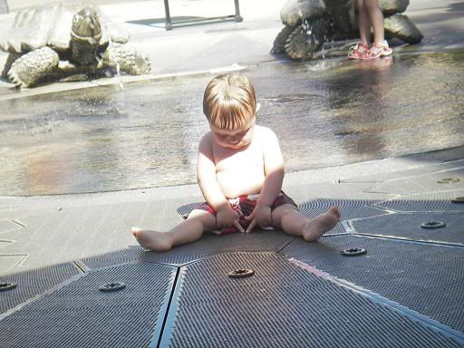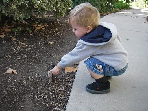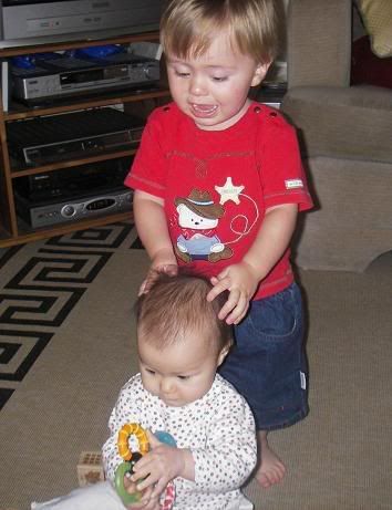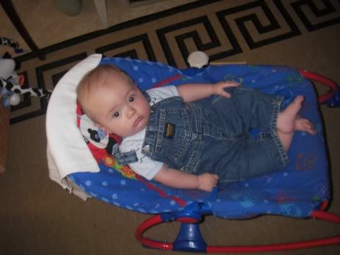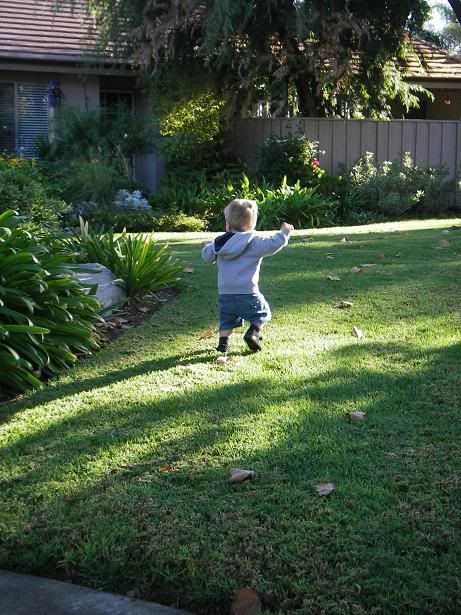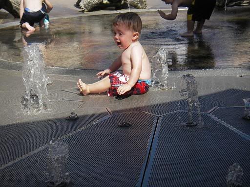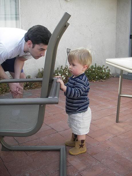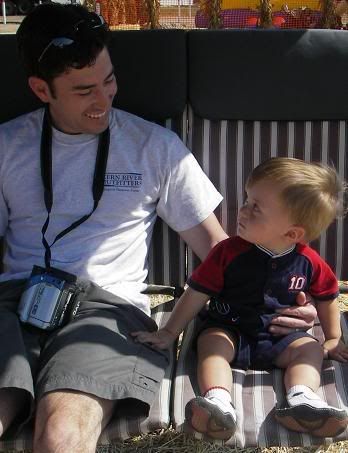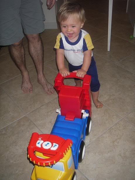 While we were gone, Nate did great. He didn't fuss one time while we were gone; he was content finding new things to play with in my parents' house (slamming doors, playing with drawer handles, trying to catch Jack's tail) and did really, really well for them. When Jon and I got back on Saturday afternoon, Nate was playing by himself with some blocks in the dining room. Jon and I walked in, he looked up, his eyes got wide, and he got a huge smile on his face. Then he started giggling. He reached for me and I picked him up, and he laughed and kicked his legs. Then he reached for Jon, who held him while he laughed. Then he reached for my mom and did the same thing. Then he reached for me again. He kept going around the circle like that for a couple of minutes.
